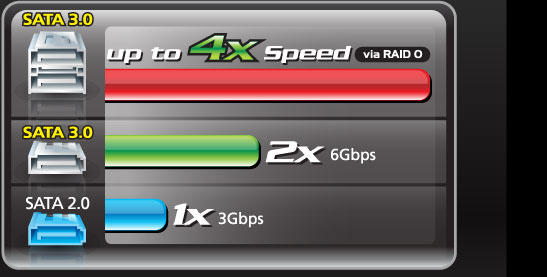 Daha önce hiç olmadığı kadar fazla USB 3.portuyla (P67A-UD7’de 10 taneye kadar), GIGABYTE 6 serisi anakartlar taşınabilir flash ve harici yedekleme sürücüleri için son derece hızlı bir bağlantı sağlamaktadır (10x USB 2.0 hıza kadar). Gündelik operasyonlar sırasında çarpıcı bir performans artışı için, işletim sisteminiz ve uygulama sürücünüz olarak bilgisayarınızı bir SATA 6Gbps sabit disk sürücüsü ile yapılandırın. SATA 6Gbps ile birleştirildiğinde GIGABYTE XHD Teknolojisi, kullanıcıların mümkün olabileceğini düşünmedikleri kadar hızlı bir şekilde sistemlerini çalıştırmalarını ve uygulamalarını başlatmalarını sağlayan basit ve sezgisel bir hizmet yazılımı aracılığıyla teorik olarak SATA 3Gbps’nin 4 katına kadar bir performans artışı sağlar. |